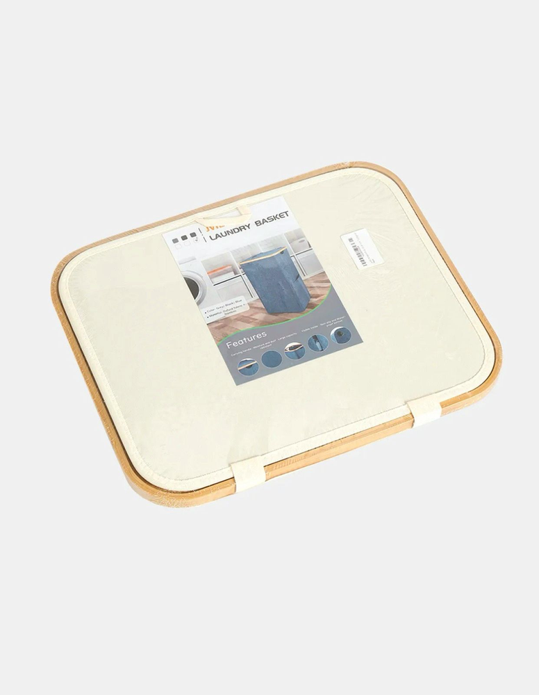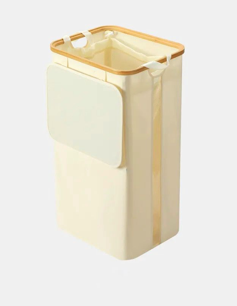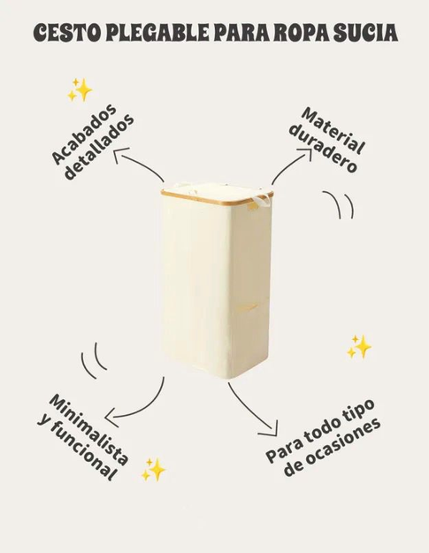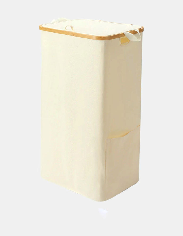 Cesto organizador alto de lona resistente, ideal para almacenar ropa, toallas o artículos del hogar. Fabricado en material tipo lona color crema con estructura firme y borde superior de bambú para mayor estabilidad. Cuenta con tapa abatible, asas superiores para facilitar el transporte, bolsillo lateral y diseño vertical que optimiza el espacio. Perfecto para mantener el orden en dormitorios, baños o lavaderos.